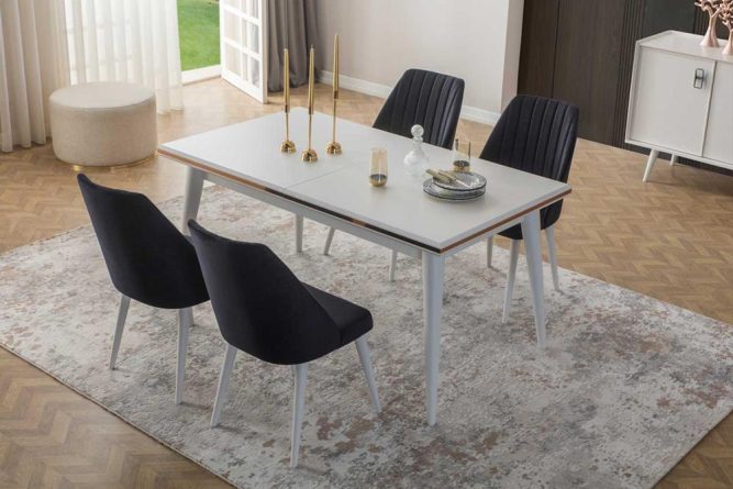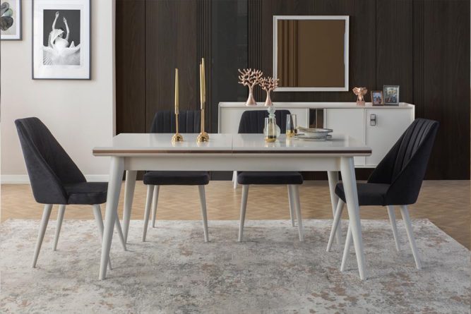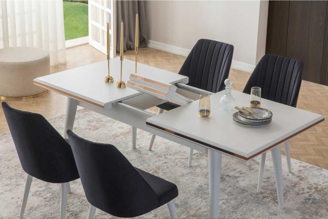| Yemek Masası | Üst tabla MDF malzeme üzeri lake boya ile üretilmiştir. Masa tablası ortadan açılabilir özelliğe sahip değildir. |